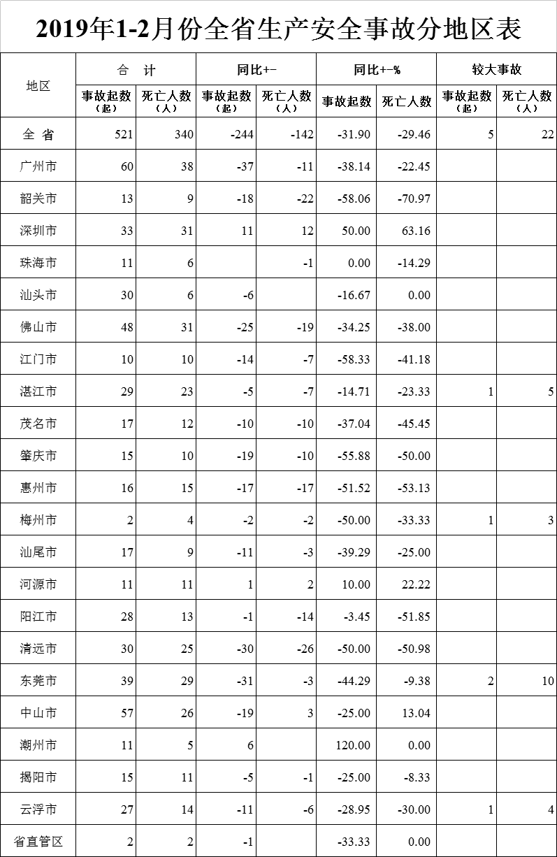 1—2月,全省安全生产形势稳中向好,较大及以上事故得到有效遏制,共发生事故521起、死亡340人,同比分别下降31.9%和29.5%,其中发生较大事故5起、死亡22人,同比分别下降58.3%和60.0%;未发生重特大事故。