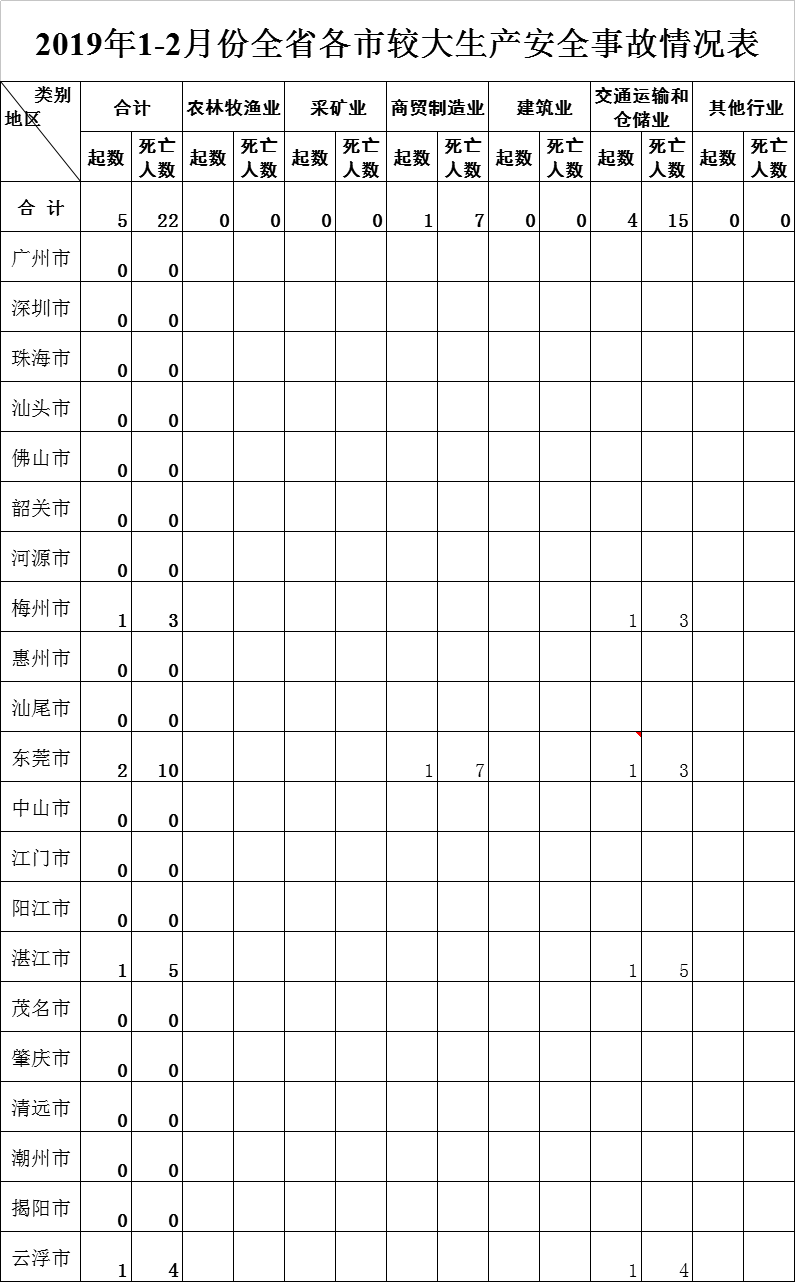 2月份,全省安全生产总体形势保持稳定向好趋势,共发生生产安全事故(以下简称事故)154起、死亡90人,同比分别下降23.8%和32.8%,环比分别下降57.2%和64.0%;发生较大事故2起、死亡12人,同比均下降50.0%;未发生重特大事故。2月大部分行业领域事故起数和死亡人数同比、环比均明显下降,其中渔业船舶、采矿业、水上交通未发生事故。
